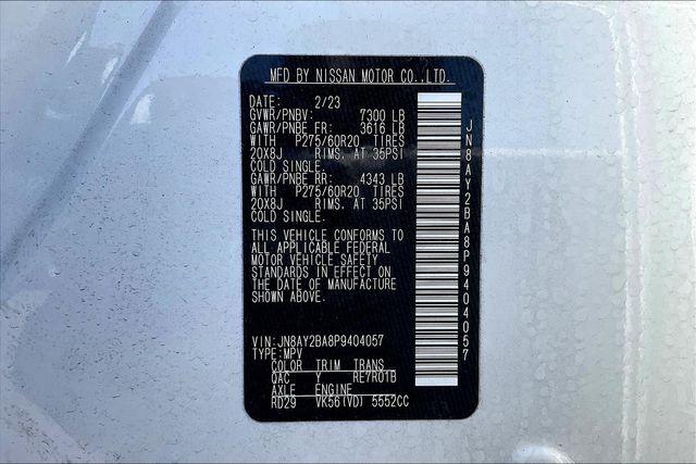 CARFAX One-Owner. Clean CARFAX. Aspen White Tricoat 2023 Nissan Armada SL RWD 7-Speed Automatic 5.6L V8 DOHC 32V LEV3-ULEV125 400hpHomer Skelton is committed to meeting your automotive needs with speed flexibility and friendly customer service. Recent Arrival! Odometer is 1744 miles below market average!Midnight Edition Package (20"" Wheels 20"" x 8J Aluminum Alloy Wheels Auto-Dimming Exterior Mirror w/LED Turn Signals Black Painted Grille Black Painted Roof Rails Cargo Mat & Midnight Edition Floor Mats Front & Rear Lower Center Bumper Fascias Leather Appointed Seat Trim and Rear LED Lamps w/Black Paint Finisher) Captain's Chairs Package (2nd Row Captain's Chairs and 2nd Row Center Console w/Padded Armrest) Navigation System 13 Speakers 2.94 Axle Ratio 3rd row seats: split-bench 4-Wheel Disc Brakes ABS brakes Air Conditioning Alloy wheels AM/FM radio: SiriusXM Anti-whiplash front head restraints Auto High-beam Headlights Auto tilt-away steering wheel Auto-dimming door mirrors Auto-dimming Rear-View mirror Auto-leveling suspension Automatic temperature control Bose 13-Speaker Premium Audio System Brake assist Bumpers: body-color Delay-off headlights Driver door bin Driver vanity mirror Dual front impact airbags Dual front side impact airbags Electronic Stability Control Emergency communication system: NissanConnect Services Four wheel independent suspension Front anti-roll bar Front Bucket Seats Front Center Armrest Front dual zone A/C Front fog lights Front reading lights Fully automatic headlights Garage door transmitter: HomeLink Heated door mirrors Heated Front Bucket Seats Heated front seats Heated steering wheel Illuminated entry Illuminated Kick Plates Knee airbag Leather Shift Knob Leather-Appointed Seat Trim Low tire pressure warning Memory seat Midnight Edition Floor Mats & Cargo Mat NissanConnect featuring Apple CarPlay and Android Auto Occupant sensing airbag Outside temperature display Overhead airbag Overhead console Panic alarm Passenger door bin Passenger vanity mirror Power door mirrors Power driver seat Power Liftgate Power moonroof Power passenger seat Power steering Power windows Premium audio system: Bose Radio: NissanConnect w/SiriusXM Rear air conditioning Rear anti-roll bar Rear reading lights Rear seat center armrest Rear window defroster Rear window wiper Reclining 3rd row seat Remote keyless entry Roof rack: rails only Security system Speed control Speed-sensing steering Speed-Sensitive Wipers Split folding rear seat Spoiler Steering wheel memory Steering wheel mounted audio controls Tachometer Telescoping steering wheel Tilt steering wheel Traction control Trip computer Turn signal indicator mirrors Variably intermittent wipers Voltmeter and Wheels: 20"" x 8J Painted Alloy.